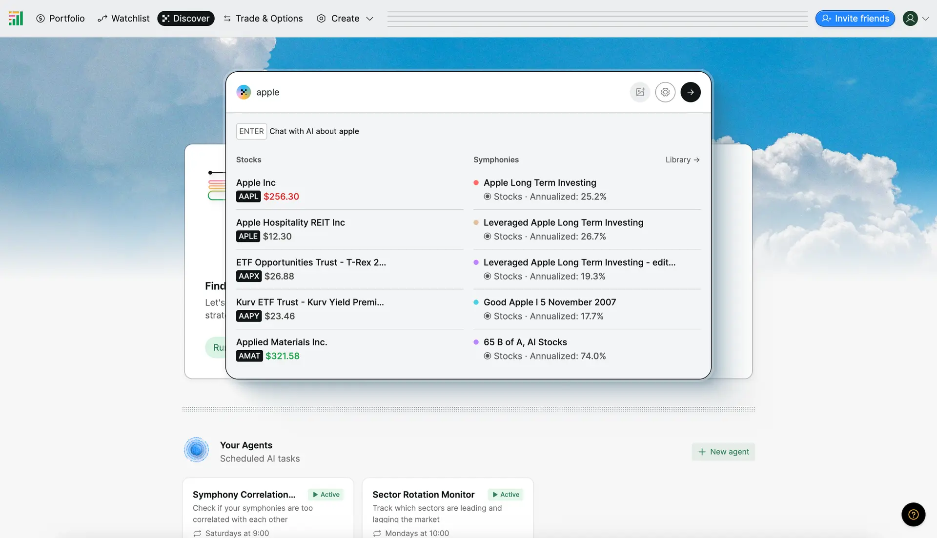 - Share your preferences. Tell the AI what you're interested in (tech stocks, ETFs, crypto, momentum strategies) and it will surface symphonies that match your approach. No search filters required.